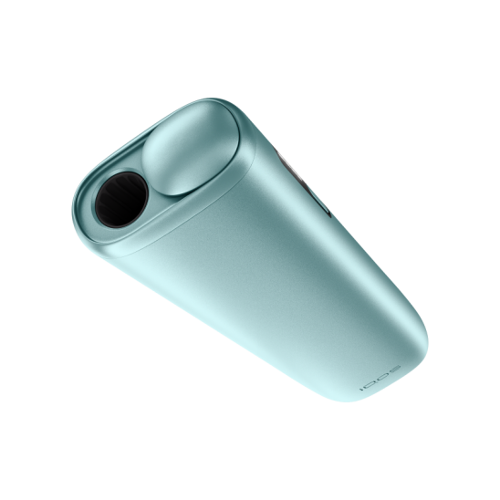 IQOS ILUMA i ONE ierīce uz tirkīza krāsas fona.